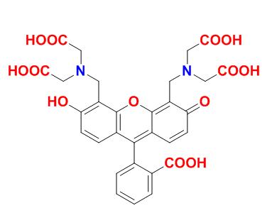 鈣黃綠素,也稱為熒光素,熒光素復(fù)合物,是一種熒光鈣指示劑,其激發(fā)和發(fā)射波長(zhǎng)分別為495和515nm。鈣黃綠素在100 mM以上的濃度下會(huì)自動(dòng)猝滅。它用作EDTA滴定鈣離子和熒光測(cè)定鈣的絡(luò)合指示劑,微溶于水。質(zhì)子解離常數(shù)為pKa1的= 2.1,pKa2 = 2.9,pKa3 = 4.2,pKa4 = 5.5,pKa5 = 10.8和pKa6 = 11.7。鈣黃綠素溶液在酸性條件下發(fā)出黃綠色熒光,而在堿性條件下不發(fā)出熒光。但是,鈣黃綠素在堿性條件下在金屬離子(例如Al,Ba,Cu,Mg和Zn)存在下發(fā)出熒光。因此,鈣黃綠素還可以用于除Ca之外的這些重金屬離子的直接熒光滴定。